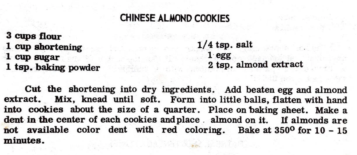 Cut the shortening into dry ingredients. Add beaten egg and almond extract. Mix, knead until soft. Form into little balls, flatten with hand into cookies about the size of a quarter. Place on baking sheet. Make an indent in the center of each cookies and place almond on it. If almonds are not available color dent with red coloring. Bake at 350 F for 10 – 15 minutes.