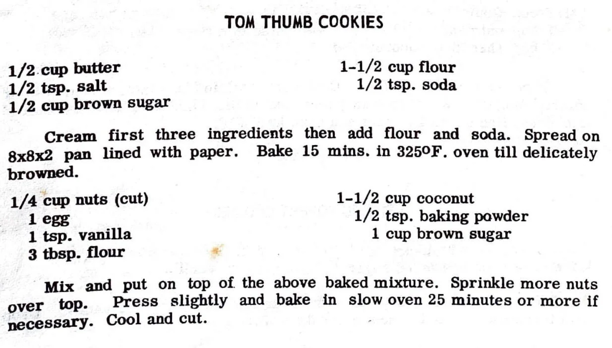 Mix and put on top of the above baked mixture. Sprinkle more nuts over top. Press slightly and bake in slow oven 25 minutes or more if necessary. Cool and cut.