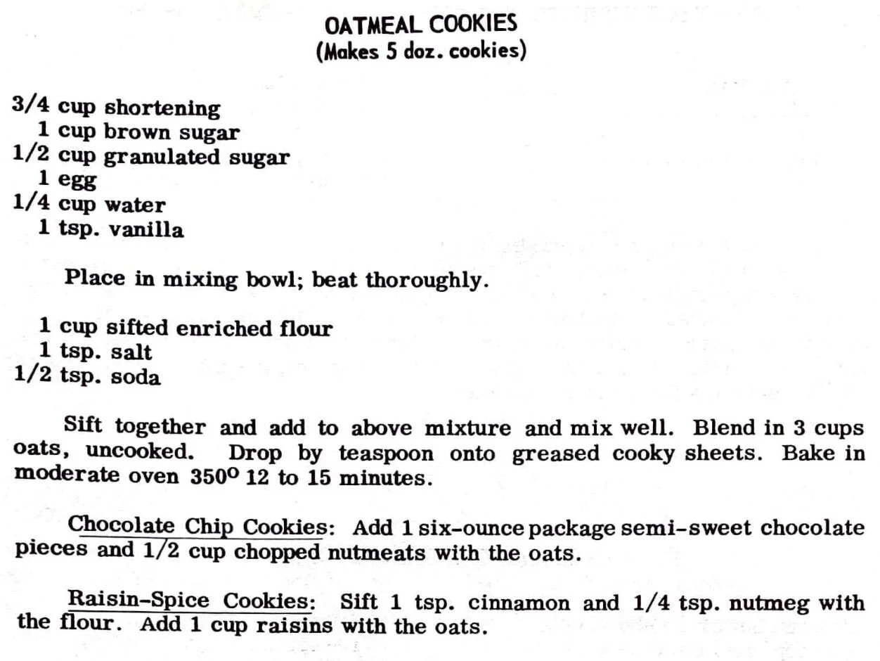 Chocolate Chip Cookies: Add 1 six-ounce package semi-sweet chocolate pieces and 1/2 cup chopped nutmeats with the oats.
