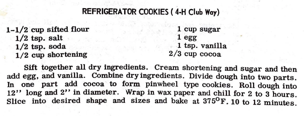 Sift together all dry ingredients. Cream shortening and sugar and then add egg, and vanilla. Combine dry ingredients. Divide dough into two parts. In one part add cocoa to form pinwheel type cookies. Roll dough into 12” long and 2” in diameter. Wrap in wax paper and chill for 2 to 3 hours. Slice into desired shape and sizes and bake at 375 F. 10 to 12 minutes.