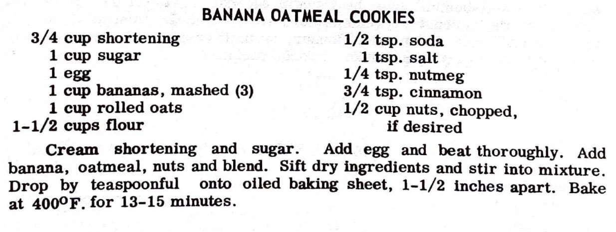 Cream shortening and sugar. Add egg and beat thoroughly. Add banana, oatmeal, nuts and blend. Sift dry ingredients and stir into mixture. Drop by teaspoonful onto oiled baking sheet, 1-1/2 inches apart. Bake at 400 F. for 13-15 minutes.