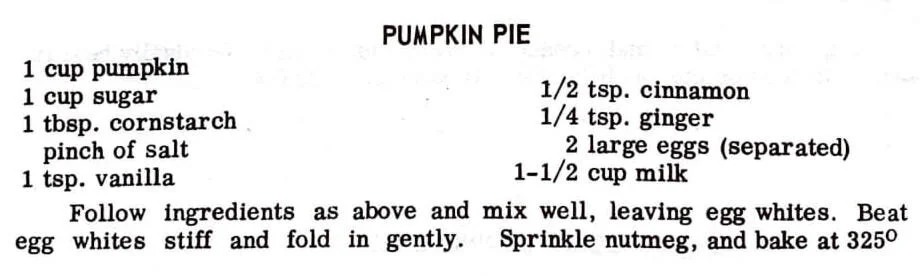 Follow ingredients as above and mix well, leaving egg whites. Beat egg whites stiff and fold in gently. Sprinkle nutmeg, and bake at 325 F.