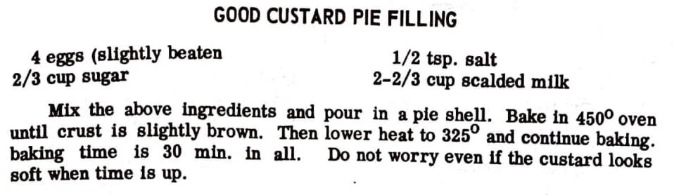 Mix the above ingredients and pour in a pie shell. Bake In 450 F oven until crust is slightly brown. Then lower heat to 325 F and continue baking. baking time is 30 min. In all. Do not worry even if the custard looks soft when time is up.