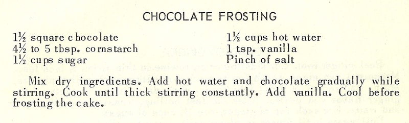 Mix dry ingredients. Add hot water and chocolate gradually while stirring. Cook until thick stirring constantly. Add vanilla. Cool before frosting the cake.