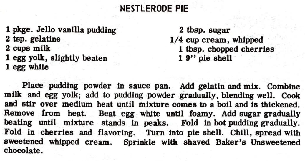 Place pudding powder in sauce pan. Add gelatin and mix. Combine milk and egg yolk; add to pudding powder gradually, blending well. Cook and stir over medium heat until mixture comes to a boil and is thickened. Remove from heat. Beat egg white until foamy. Add sugar gradually beating until mixture stands in peaks. Fold in hot pudding gradually. Fold in cherries and flavoring. Turn into pie shell. Chill, spread with sweetened whipped cream. Sprinkle with shaved Baker’s Unsweetened chocolate.