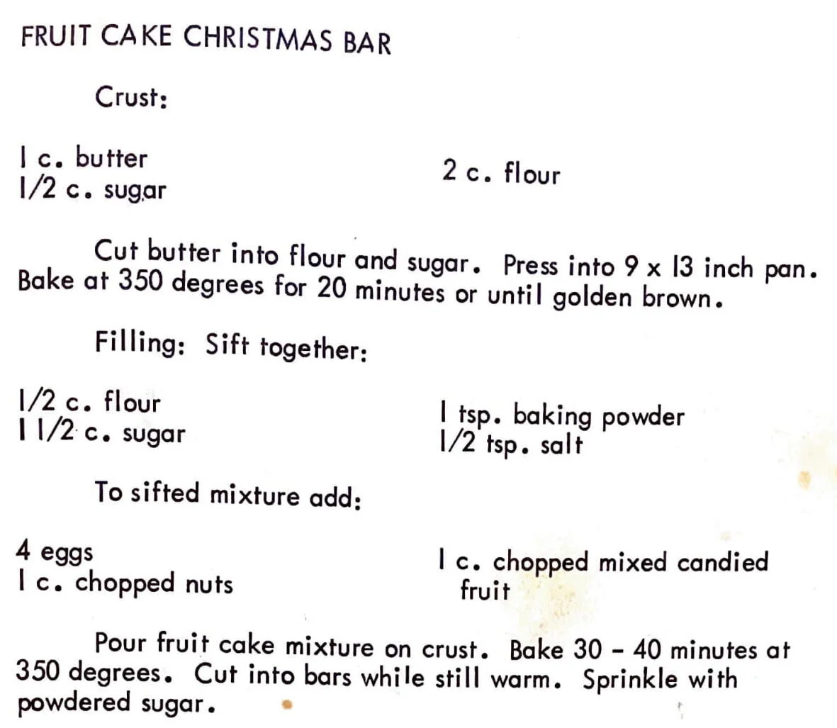 Part I1/2 cup butter1/2 cup raw sugar or brown sugar1 cup flour Mix and put evenly in large square cake pan, 10″, covering the bottom. Bake in 375 F. for 10 minutes or till lightly brown while preparing the following: Part II2 eggs, beaten stiff7/8 cup brown sugar1 tsp. vanilla Part III2 tbsp. flour1/2 tsp….