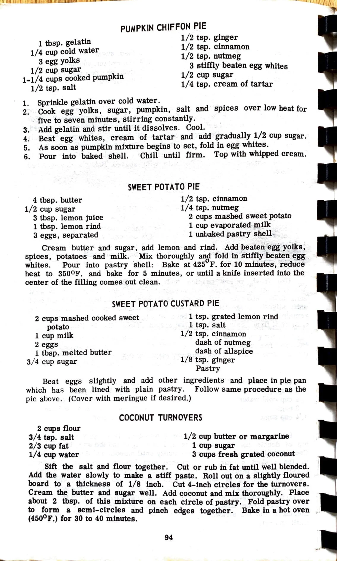 Sift the salt and flour together. Cut or rub in fat until well blended. Add the water slowly to make a stiff paste. Roll out on a slightly floured board to a thickness of 1/8 inch. Cut 4-inch circles for the turnovers. Cream the butter and sugar well. Add coconut and mix thoroughly. Place about 2 tbsp. of this mixture on each circle of pastry. Fold pastry over to form a semi-circles and pinch edges together. Bake in a hot oven (450 F.) for 30 to 40 minutes.