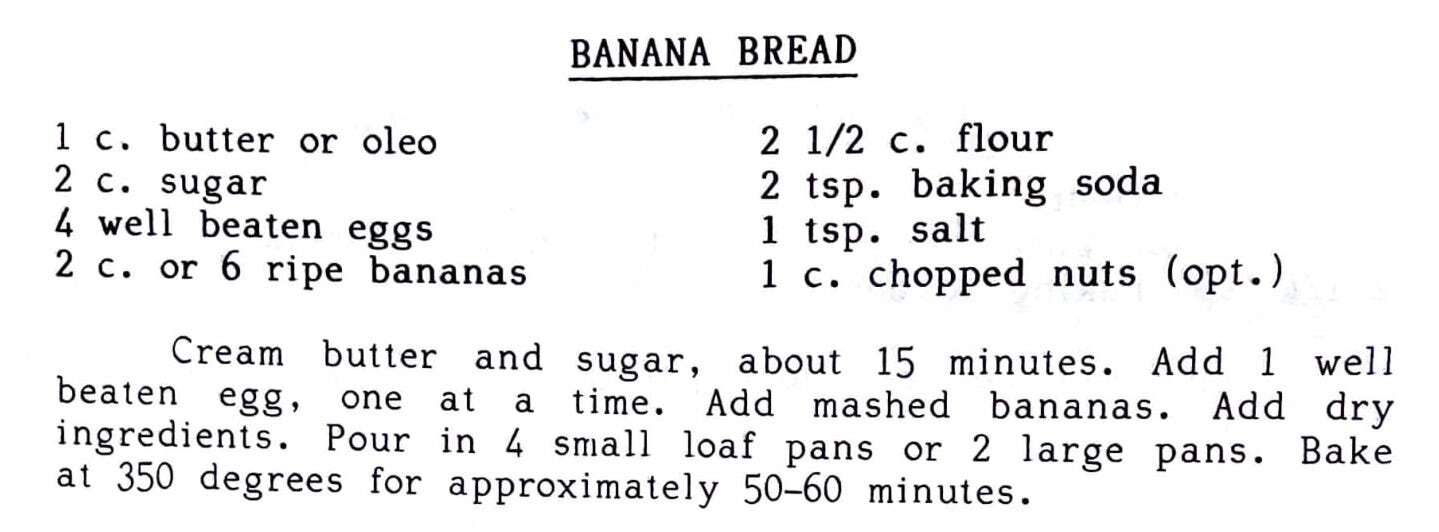 Cream butter and sugar, about 15 minutes. Add 1 well beaten egg, one at a time. Add mashed bananas. Add dry ingredients. Pour in 4 small loaf pans or 2 large pans. Bake at 350 degrees for approximately 50-60 minutes.