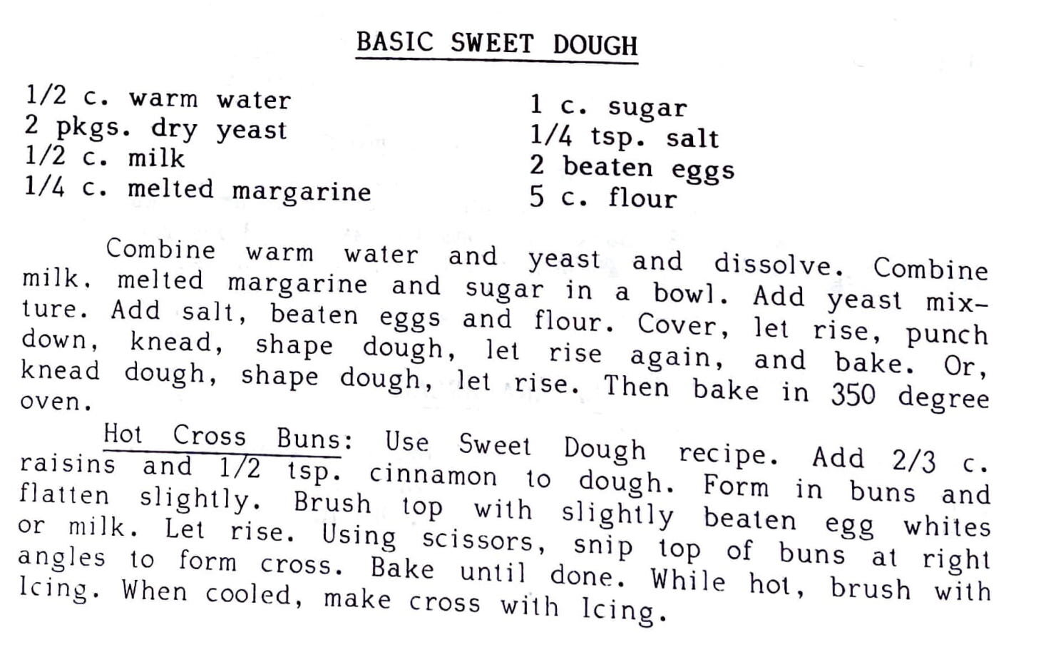 Hot Cross Buns: Use Sweet Dough recipe. Add 2/3 c. raisins and 1/2 tsp. cinnamon to dough. Form in buns and flatten slightly. Brush top with slightly beaten egg whites or milk. Let rise. Using scissors, snip top of buns at right angles to form cross. Bake until done. While hot, brush with Icing. When cooled, make cross with Icing.