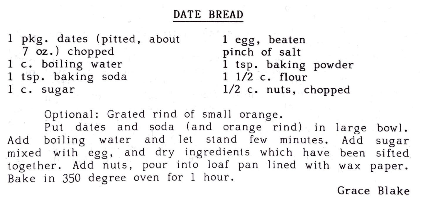 Put dates and soda (and orange rind) in large bowl. Add boiling water and let stand few minutes. Add sugar mixed with egg, and dry ingredients which have been sifted together. Add nuts, pour into loaf pan lined with wax paper. Bake in 350 degree oven for 1 hour.