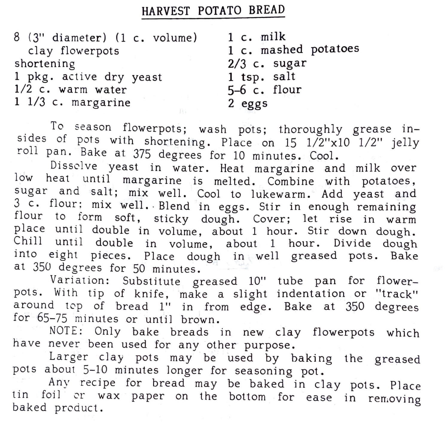 Any recipe for bread may be baked in clay pots. Place tin foil or wax paper on the bottom for ease in removing baked product.