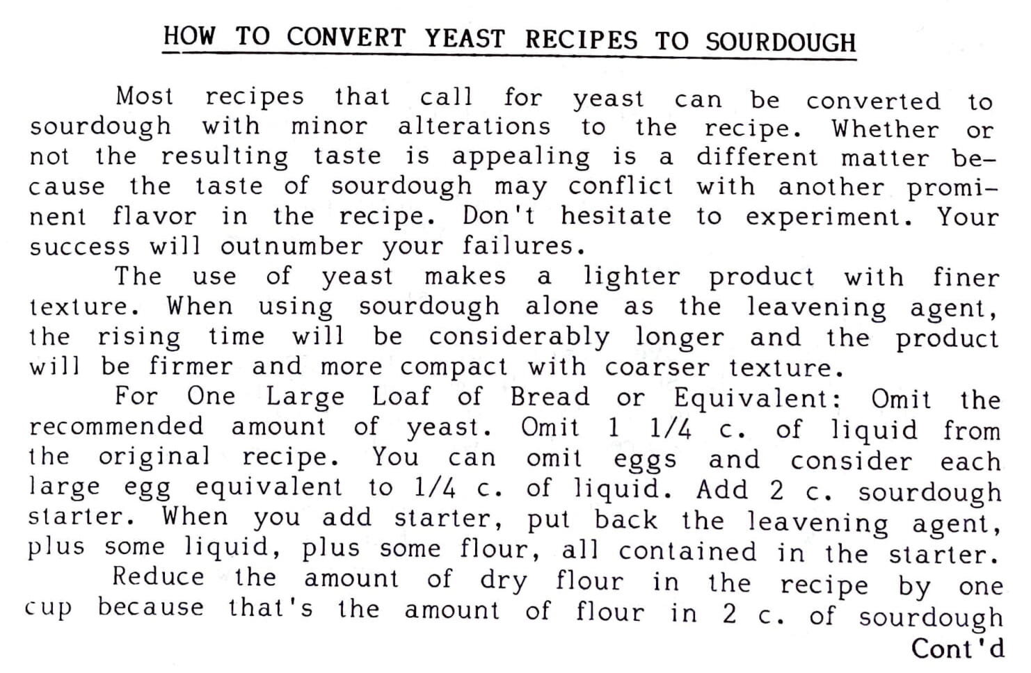 For One Large Loaf of Bread or Equivalent: Omit the recommended amount of yeast. Omit 1-1/4 c. of liquid from the original recipe. You can omit eggs and consider each large egg equivalent to 1/4 c. of liquid. Add 2 c. sourdough starter. When you add starter, put back the leavening agent, plus some liquid, plus some flour, all contained in the starter.