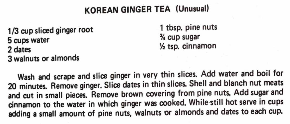Wash and scrape and slice ginger in very thin slices. Add water and boil for 20 minutes. Remove ginger. Slice dates in thin slices. Shell and blanch nut meats and cut in small pieces. Remove brown covering from pine nuts. Add sugar and cinnamon to the water in which ginger was cooked. While still hot serve in cups adding a small amount of pine nuts, walnuts or almonds and dates to each cup.