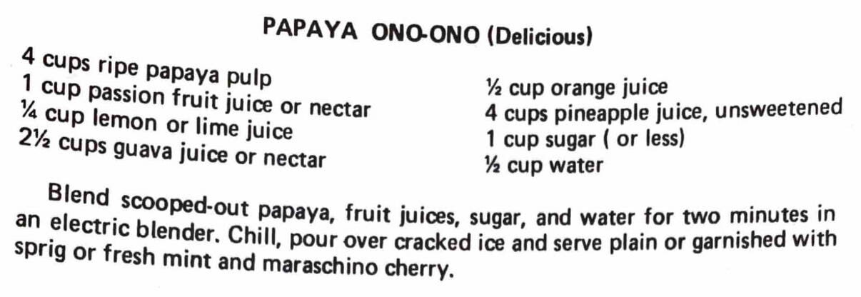 Blend scooped-out papaya, fruit juices, sugar, and water for two minutes in an electric blender. Chill, pour over cracked ice and serve plain or garnished with sprig or fresh mint and maraschino cherry.