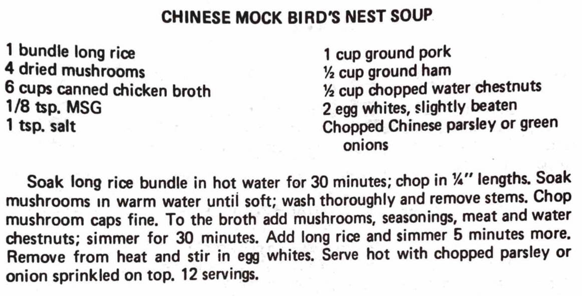 Soak long rice bundle in hot water for 30 minutes; chop in 1/4” lengths. Soak mushrooms in warm water until soft; wash thoroughly and remove stems. Chop mushroom caps fine. To the broth add mushrooms, seasonings, meat and water chestnuts; simmer for 30 minutes. Add long rice and simmer 5 minutes more. Remove from heat and stir in egg whites. Serve hot with chopped parsley or onion sprinkled on top. 12 servings.