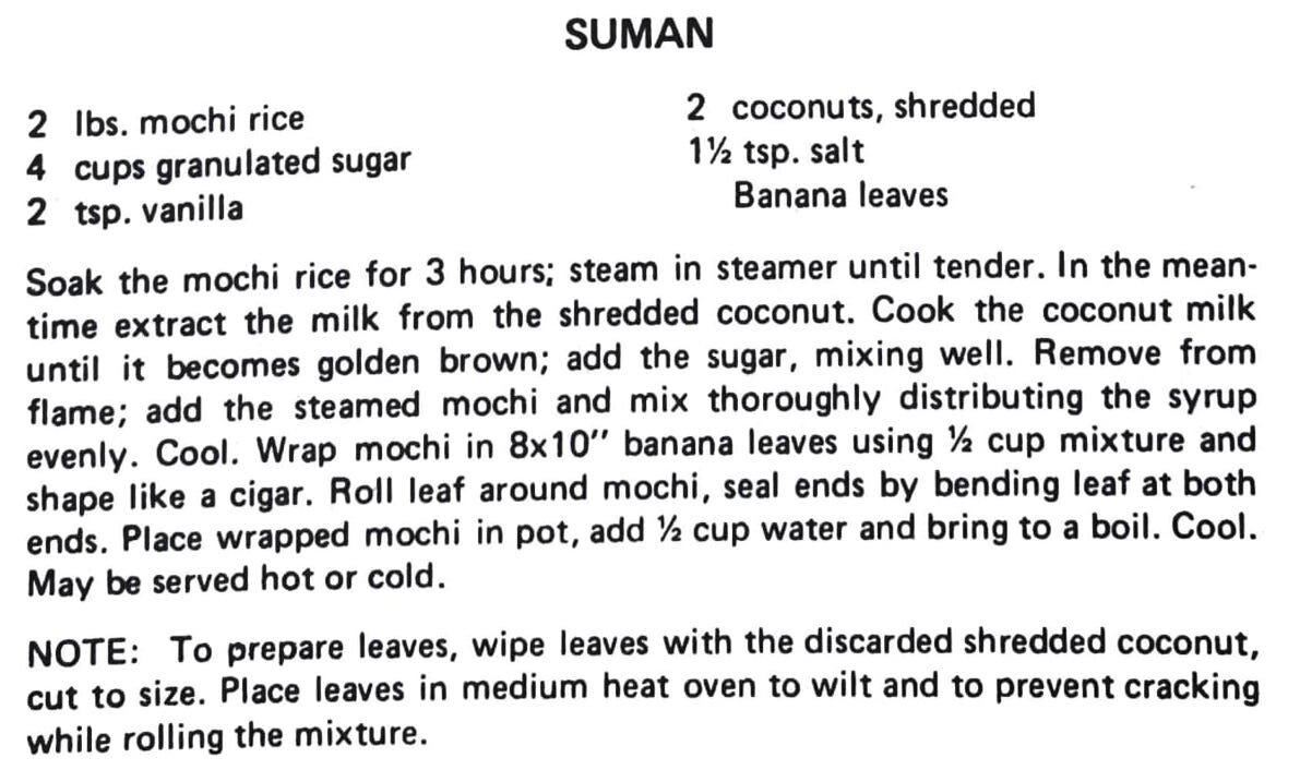 Soak the mochi rice for 3 hours; steam in steamer until tender. In the meantime extract the milk from the shredded coconut. Cook the coconut milk until it becomes golden brown; add the sugar, mixing well. Remove from flame; add the steamed mochi and mix thoroughly distributing the syrup evenly. Cool. Wrap mochi in 8×10” banana leaves using 1/2 cup mixture and shape like a cigar. Roll leaf around mochi, seal ends by bending leaf at both ends. Place wrapped mochi in pot, add 1/2 cup water and bring to a boil. Cool. May be served hot or cold.