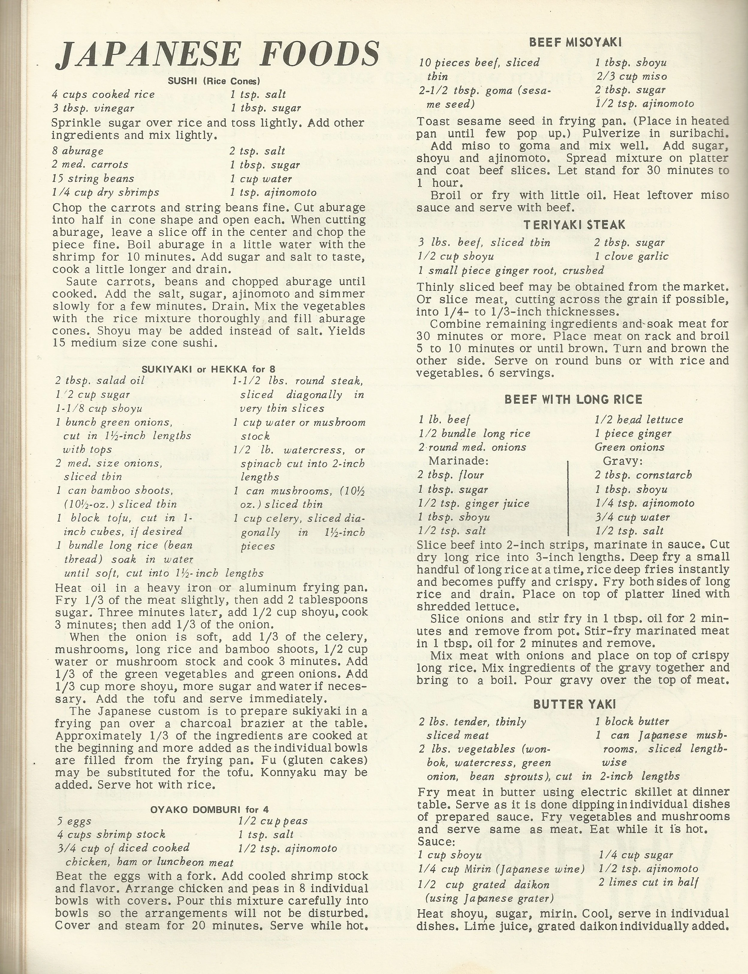 3 cups rice3 cups water When steamed and ready, mix in the following:1/2 konnyaku (made from flour of tuber root)1 small carrot6 string beans6 dried mushrooms soaked in water1/3 kamaboko1 aburage (fried bean curd)1 small gobo (burdock) seasoning:2 tbsp. shrimp flakes3-1/2 tbsp. sboyu3-1/2 tbsp. sugar1-1/2 tsp. salt1/2 tsp. gourmet powder Cut all ingredients into small…