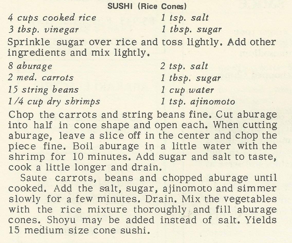 Sushi Rice:4 cups rice1/4 cup vinegar1/4 cup sugar2 tsp. salt2 tsp. ajinomoto(gourmet powder)1/4 cup dried shrimps Shrimps should be soaked in vinegar, sugar and salt. Drain shrimps and save liquid. Use this vinegar liquid to pour over cooled rice and toss lightly so rice will not be gummy. Filling:12 aburage2 medium size carrots10 string beansfew…