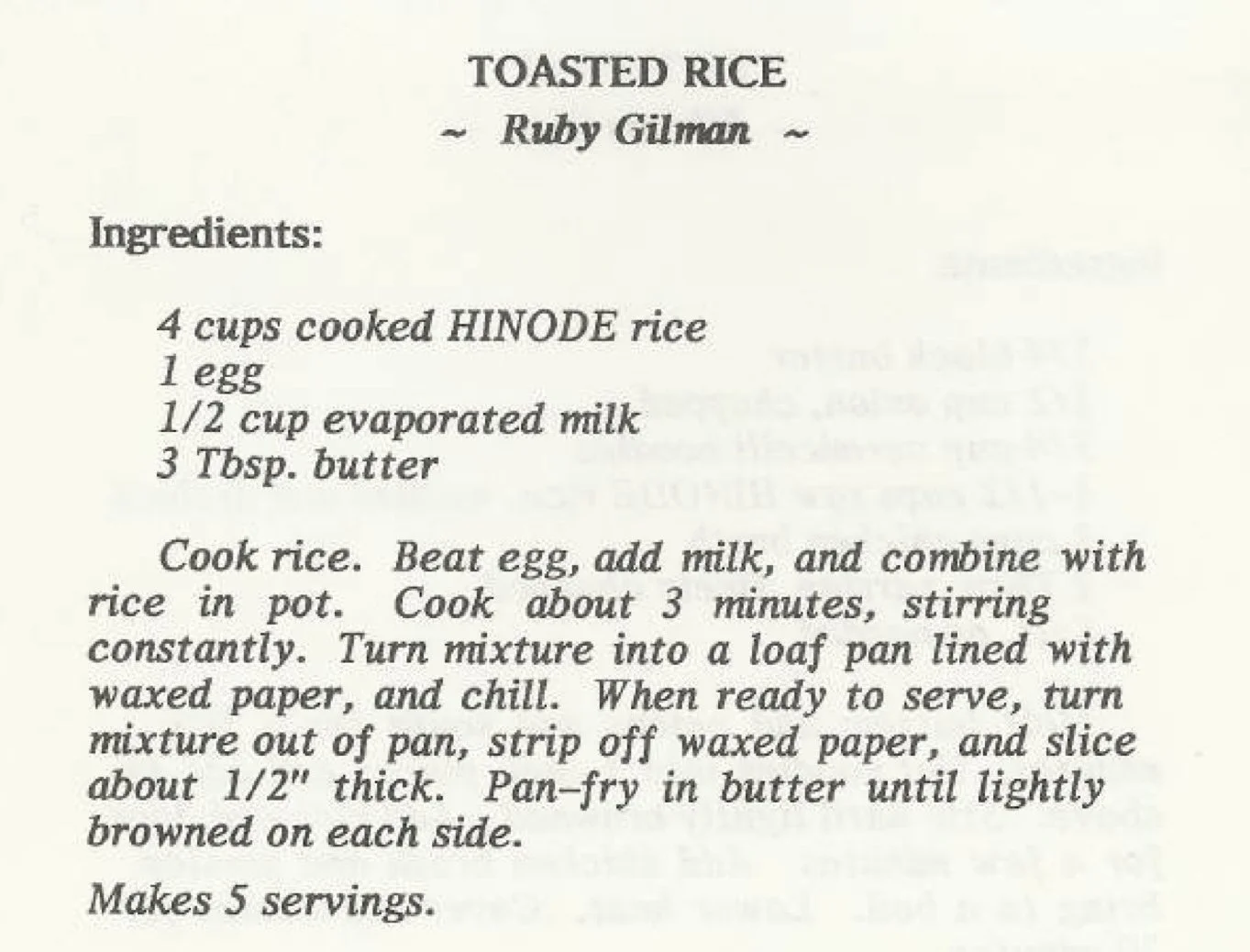 Cook rice. Beat egg, add milk, and combine with rice in pot. Cook about 3 minutes, stirring constantly. Turn mixture into a loaf pan lined with waxed paper, and chill. When ready to serve, turn mixture out of pan, strip off waxed paper, and slice about 1/2″ thick. Pan-fry in butter until lightly browned on each side.