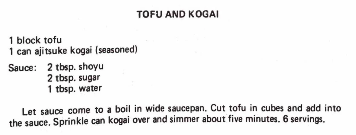 SERVES: 8 2 lb. belly pork 1 clove garlic 1 tsp. ginger 2 Tbsp. corn oil 2 blocks tofu 3 medium mushrooms 1 bunch mustard cabbage STOCK: 2 cups pork broth 2 Tbsp. shoyu 1 Tbsp. sugar 1 tsp. msg Parboil pork for 30 minutes and cut into 1/4 inch slices. Mince garlic and grate…