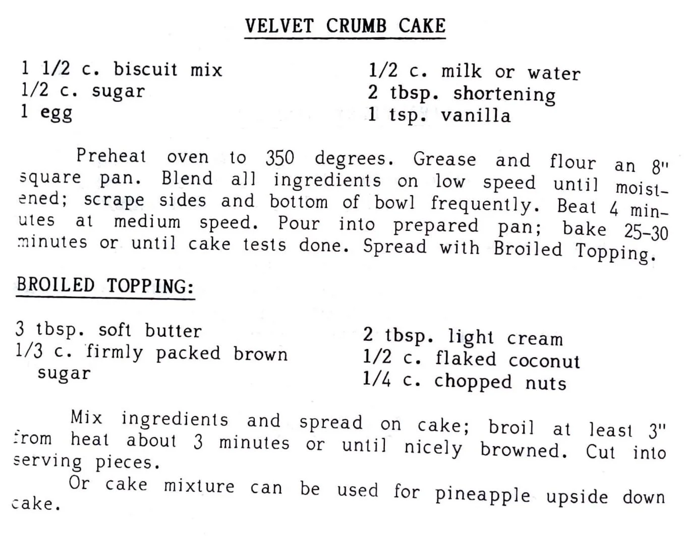 Combine dry ingredients: 1-1/2 c. Bisquick 3/4 c. sugar 1/2 tsp. baking powder 1 c. cornmeal Combine wet ingredients: 1 c. milk or 1/3 c. powdered milk plus water to make 1 c. or 1/2 c. evaporated milk plus 1/2 c. water 1 c. or 2 blocks melted margarine or butter 2 beaten eggs Combine…