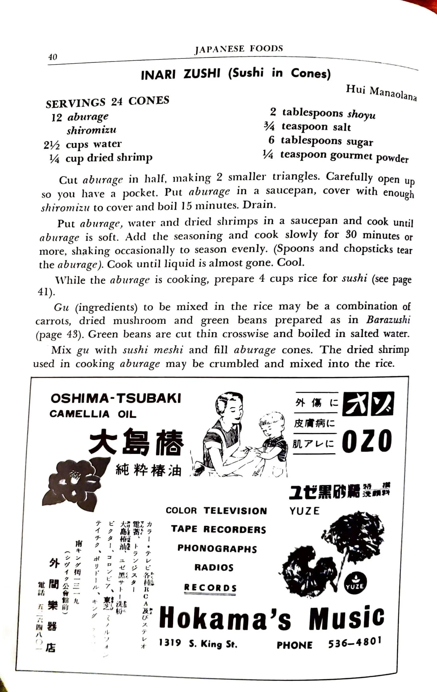 While the aburage is cooking, prepare 4 cups rice for sushi (see page 41).