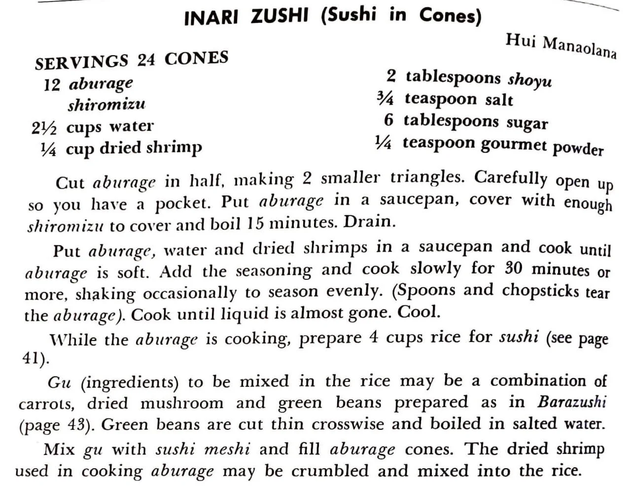 Mix gu with sushi meshi and fill aburage cones. The dried shrimp used in cooking aburage may be crumbled and mixed into the rice.