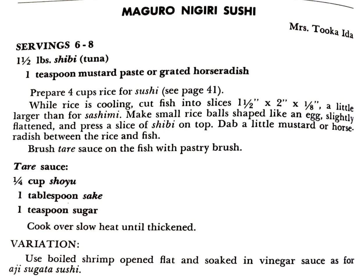 SERVINGS 4-5 1 lb. ika (cuttlefish) 3 tablespoons sugar 4 tablespoons shoyu 1/4 teaspoons salt 3 tablespoons sake 1/4 teaspoon gourmet powder Clean ika. Remove legs and triangular tips. Cut open the center section to flatten out. Place tips and legs on the flattened pieces, roll and tie with kanpyo or string. Place rolled ika…