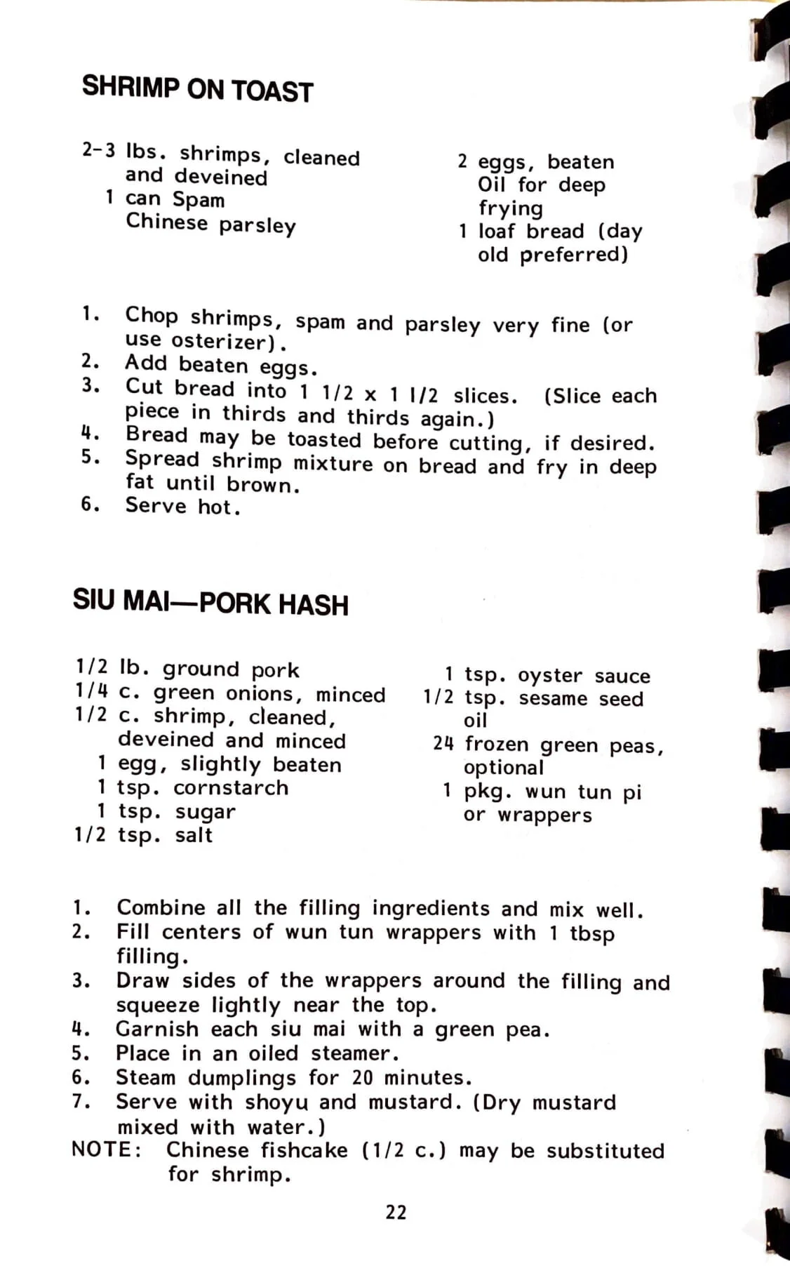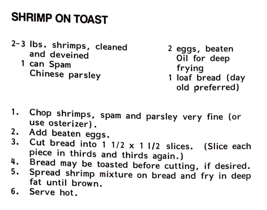 2 tofu 2 eggs 1 lb. shrimp 2-1/2 tbsp. cornstarch 1 tsp. ajinomoto 2 tsp. salt 3 tbsp. green onion 5 water chestnuts Chinese parsley Wrap the tofu in a piece of material and squeeze the tofu. Put it in a bowl then squeeze the tofu with your hands. Add the rest of the ingredients….