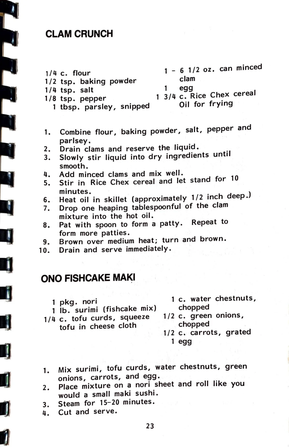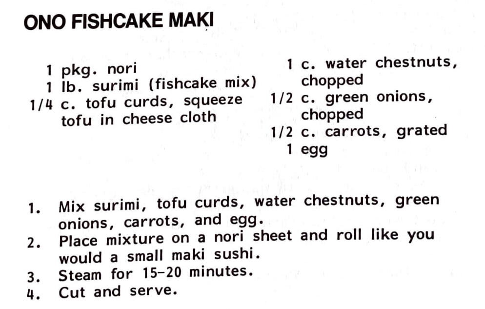 2 lbs. fresh tako 1 tsp. Hawaiian salt 1/2 cup flour Dash of pepper Oil for deep frying Wash tako in salted water. Remove head and clean. Cut head and legs into bite sized pieces. Sprinkle Hawaiian salt on tako and mix thoroughly. Please flour and pepper in a plastic bag. Add tako pieces and…