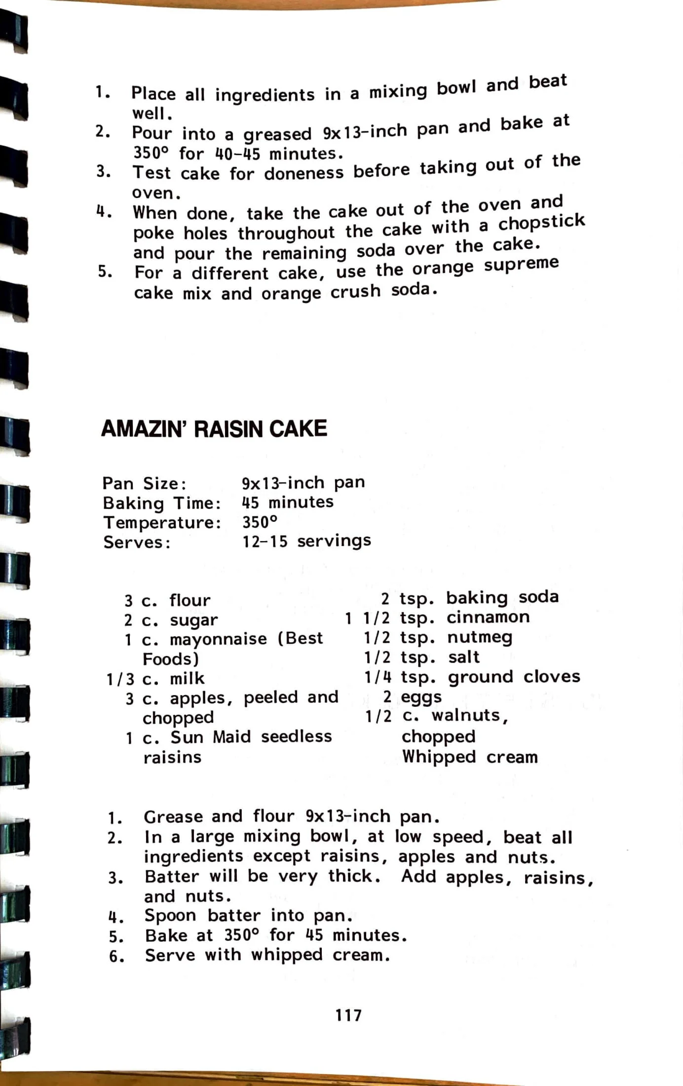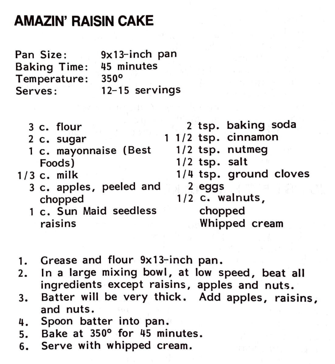 1 box seedless raisins1 cup butter (2 blocks)2 cups sugar1 tsp. cinnamon1 tsp. cloves1 tsp. allspice1 tsp. salt2 eggs4 cups sifted flour2 tsp. soda1 cup walnuts1 package fruit mix(1 package of dates may be added) Boil raisins in 2 cups water for 15-20 minutes. (Cover pot.) Remove from stove, add butter. Cool thoroughly. Sift dry…