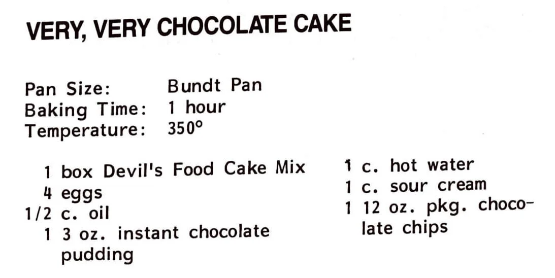 1-1/2 cup sugar1 block butter1/3 cup crisco1 cup ground sweet chocolate2 bottles Seven-up3 cups flour4 eggs3 tsp. baking powder1 tsp. baking soda1/4 tsp. salt1 tsp. vanilla Cream butter, crisco. Add sugar, eggs, beat well. Add Seven-up and flour. Bake 350 F for 35 minutes.