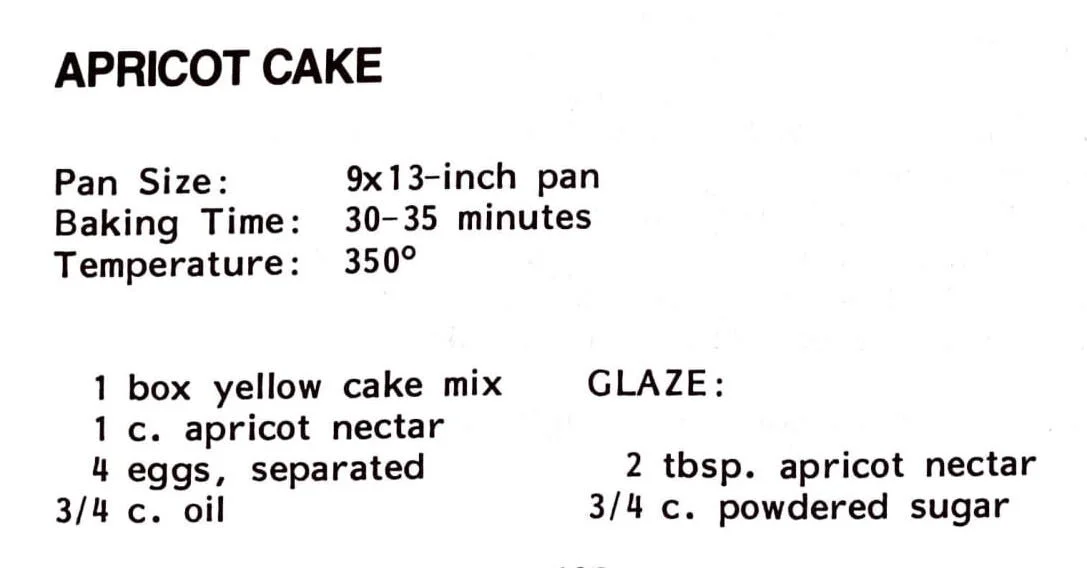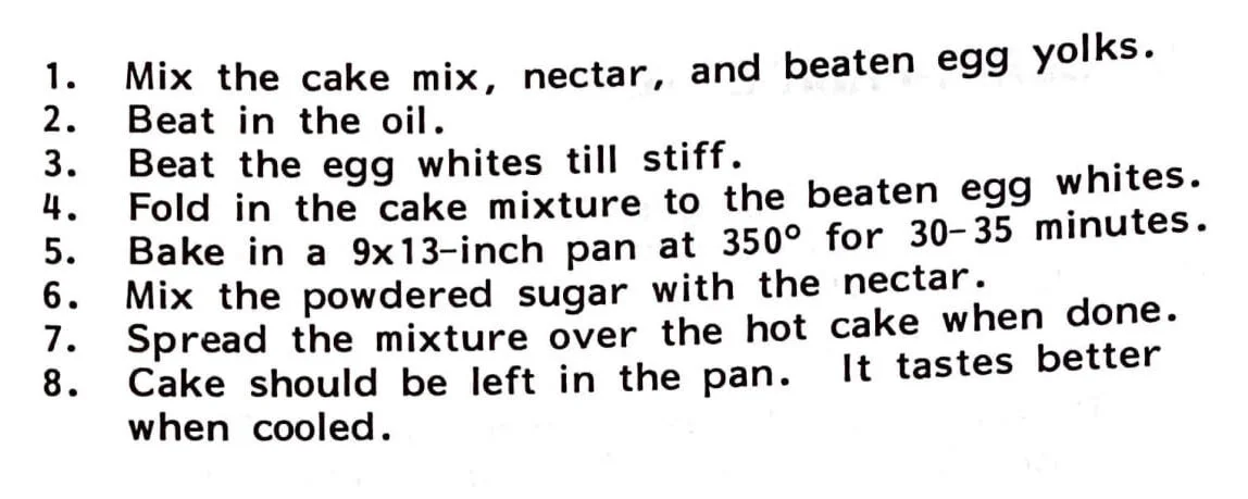 1-1/2 cup sugar1 block butter1/3 cup crisco1 cup ground sweet chocolate2 bottles Seven-up3 cups flour4 eggs3 tsp. baking powder1 tsp. baking soda1/4 tsp. salt1 tsp. vanilla Cream butter, crisco. Add sugar, eggs, beat well. Add Seven-up and flour. Bake 350 F for 35 minutes.
