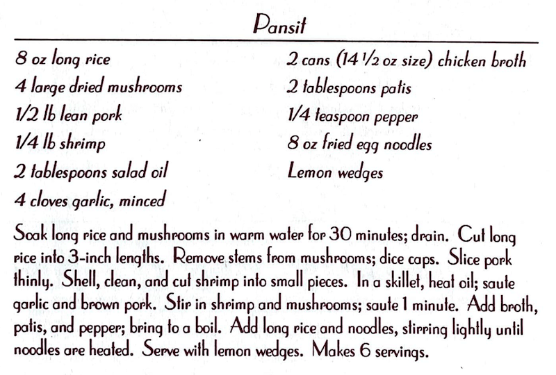 Soak long rice and mushrooms in warm water for 30 minutes; drain. Cut long rice into 3-inch lengths. Remove stems from mushrooms; dice caps. Slice pork thinly. Shell, clean, and cut shrimp into small pieces. In a skillet, heat oil; saute garlic and brown pork. Stir in shrimp and mushrooms; saute 1 minute. Add broth, patis, and pepper; bring to a boil. Add long rice and noodles, stirring lightly until noodles are heated. Serve with lemon wedges. Makes 6 servings.