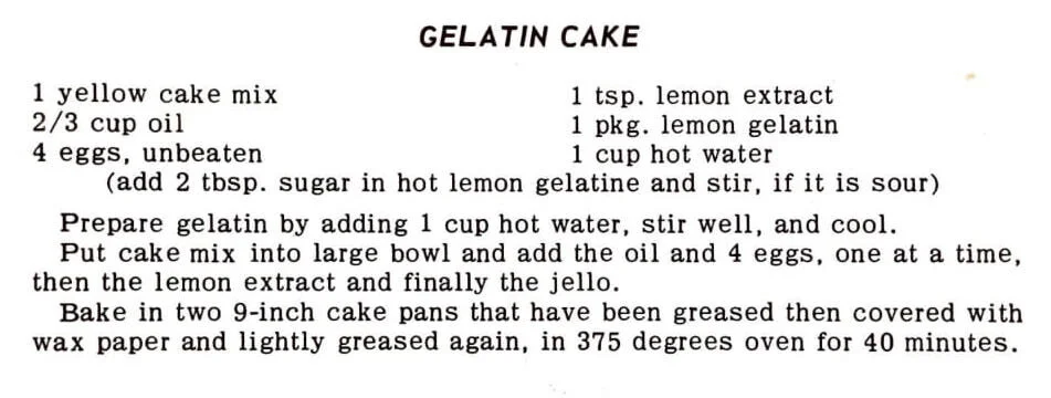 1 cup shortening 3 tsp. baking powder (double action) 2 cups sugar 4 eggs (or 2 egg yolks and 3 whole eggs) 1/2 tsp. salt 3 cups sifted Flour 3/4 cup milk 1 tsp. lemon extract 1 tsp. vanilla Cream shortening and sugar; add eggs one at a time and beat well. Stir flour, baking…