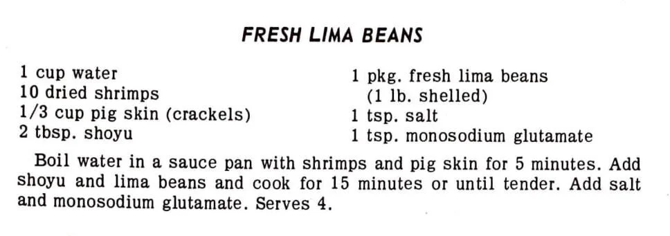 Boil water in a sauce pan with shrimps and pig skin for 5 minutes. Add shoyu and lima beans and cook for 15 minutes or until tender. Add salt and monosodium glutamate. Serves 4.