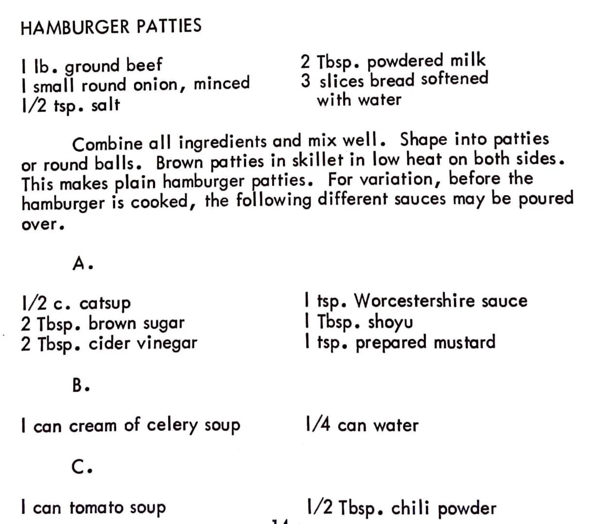 Fry in 4 tbsp. salad oil: 2 large onions (chopped) 2 cloves garlic (chopped an crushed) Add: 1-1/2 lbs. ground beef In large casserole add: 1 c. whole kernel corn 1 c. tomato puree 1 can tomatoes (#303) 2 tbsp. Chili powder 1-1/2 tsp. salt (pepper to taste) Add 2 cans of canned tamale cut…