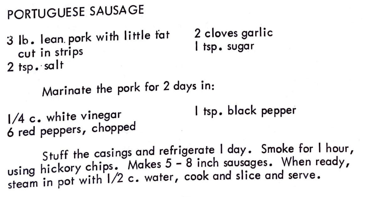 Stuff the casings and refrigerate 1 day. Smoke for 1 hour, using hickory chips. Makes 5 – 8 inch sausages. When ready, steam in pot with 1/2 c. water, cook and slice and serve.