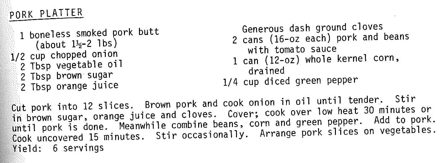 1 #2 can kidney beans1 #2 can tomatoes1 can tomato sauce1 onion, chopped small1/2 lb. hamburger1 tsp chili powderSalt to taste Mix all together and heat till onion and meat is cooked. Serve over cooked Fortified Rice. Serve with watercress and tomato salad, bread and butter and milk.