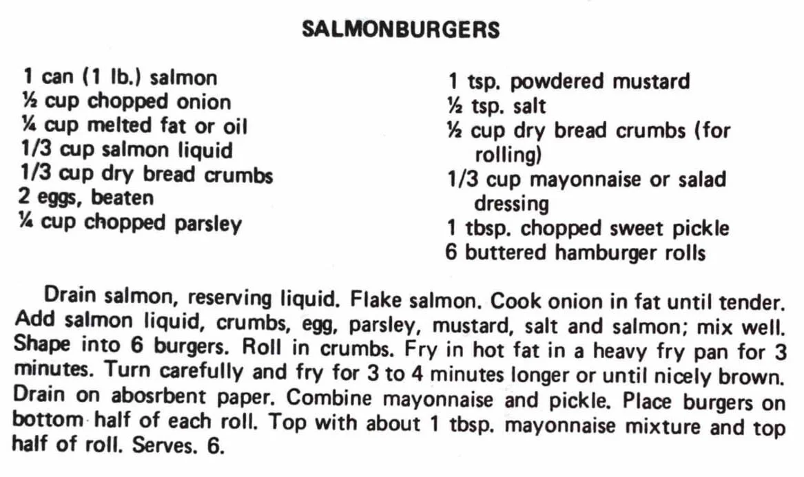 Drain salmon, reserving liquid. Flake salmon. Cook onion in fat until tender. Add salmon liquid, crumbs, egg, parsley, mustard, salt and salmon; mix well. Shape into 6 burgers. Roll in crumbs. Fry in hot fat in a heavy fry pan for 3 minutes. Turn carefully and fry for 3 to 4 minutes longer or until nicley brown. Drain on absorbent paper. Combine mayonnaise and pickle. Place burgers on bottom half of each roll. Top with about 1 tbsp. mayonnaise mixture and top half of roll. Serves 6.