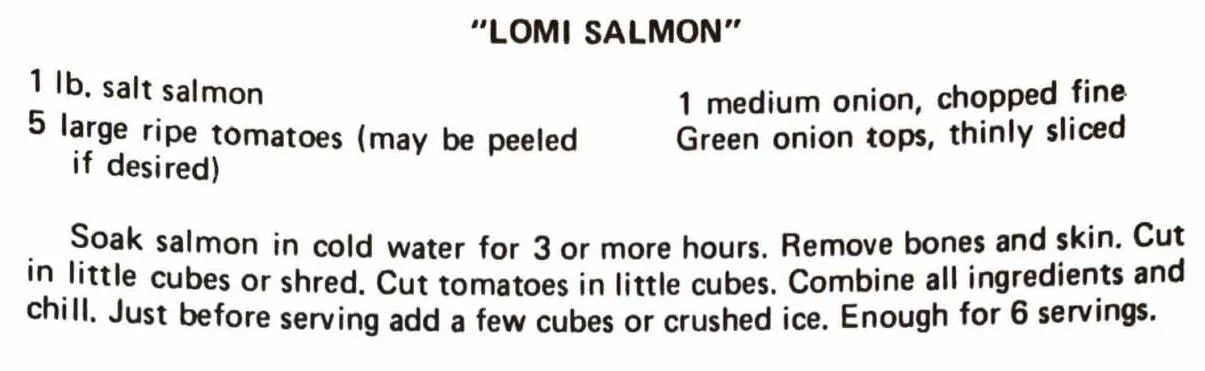 Soak salmon in cold water for 3 or more hours. Remove bones and skin. Cut in little cubes or shred. Cut tomatoes in little cubes. Combine all ingredients and chill. Just before serving add a few cubes or crushed ice. Enough for 6 servings.