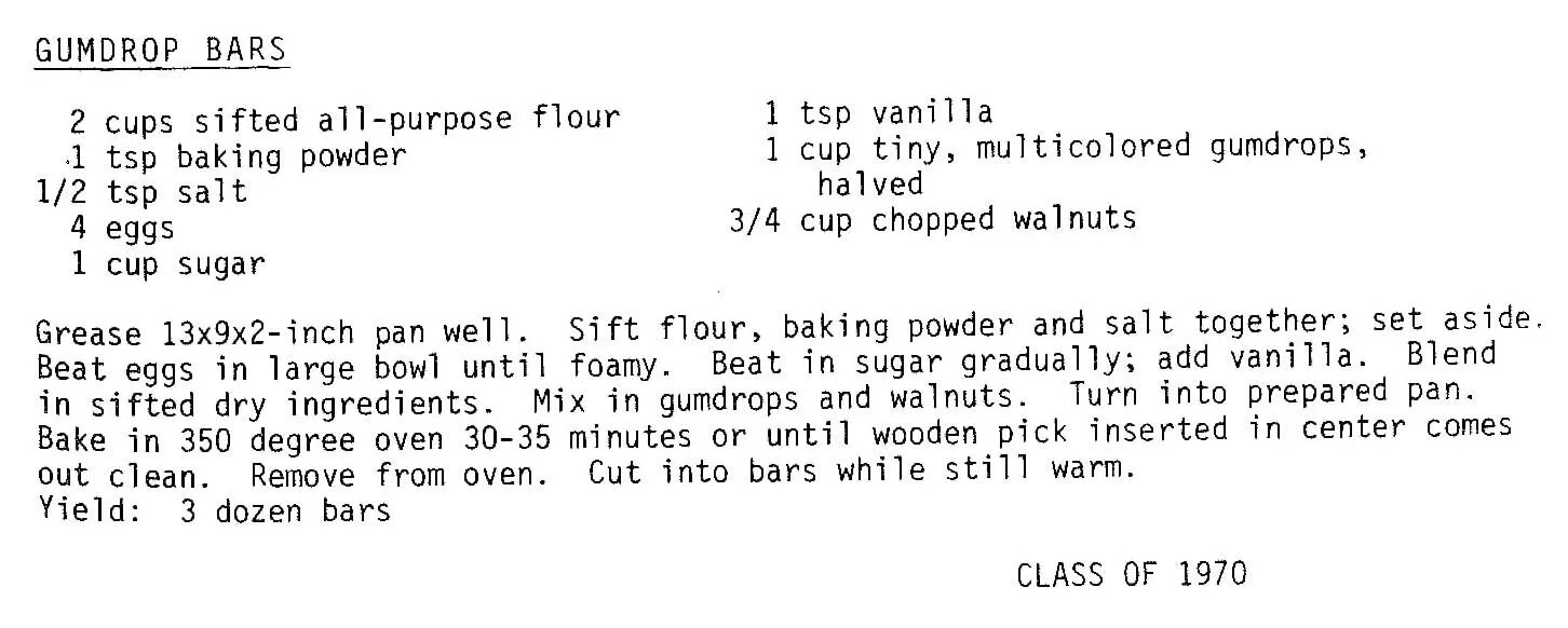 Grease 13x9x2-inch pan well. Sift flour, baking powder and salt together; set aside. Beat eggs in large bowl until foamy. Beat in sugar gradually; add vanilla. Blend in sifted dry ingredients. Mix in gumdrops and walnuts. Turn into prepared pan. Bake in 350 degree oven 30-35 minutes or until wooden pick inserted in center comes out clean. Remove from oven. Cut into bars while still warm. Yield: 3 dozen bars