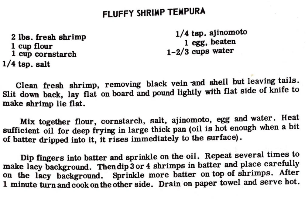 Mix together flour, cornstarch, salt, ajinomoto, egg and water. Heat sufficient oil for deep frying in large thick pan (oil is hot enough when a bit of batter dripped into it, it rises immediately to the surface).