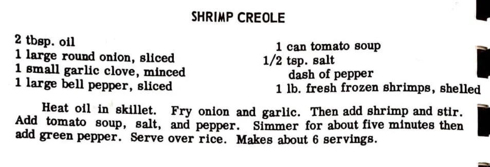Heat oil in skillet. Fry onion and garlic. Then add shrimp and stir. Add tomato soup, salt, and pepper. Simmer for about five minutes then add green pepper. Serve over rice. Makes about 6 servings.