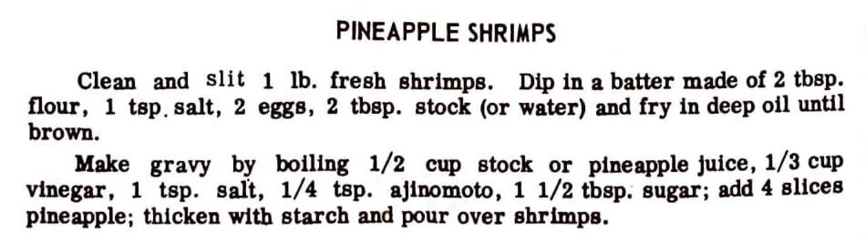 Make gravy by boiling 1/2 cup stock or pineapple juice, 1/3 cup vinegar, 1 tsp. salt, 1/4 tsp. ajinomoto, 1-1/2 tbsp. sugar; add 4 slices pineapple; thicken with starch and pour over shrimps.