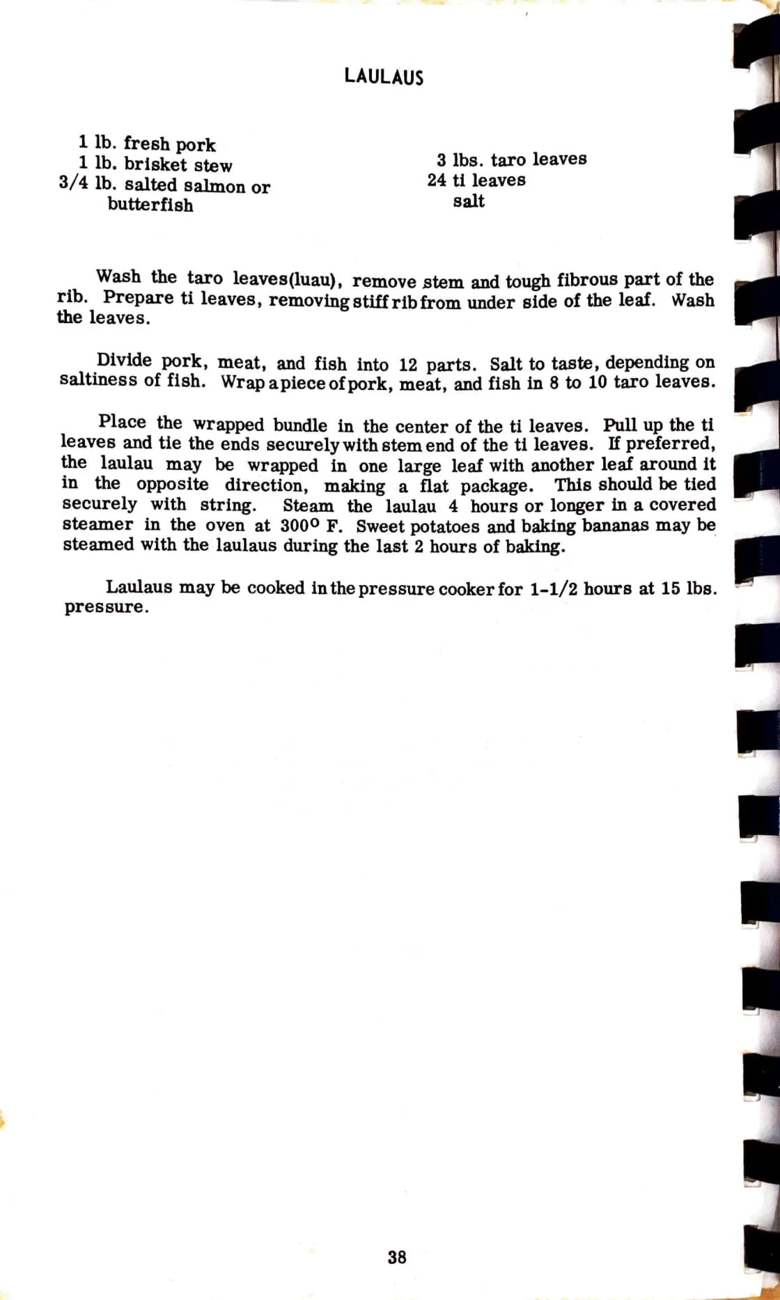 Laulaus may be cooked in the pressure cooker for 1-1/2 hours at 15 lbs. pressure.