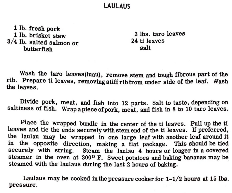 Place the wrapped bundle in the center of the ti leaves. Pull up the ti leaves and tie the ends securely with stem end of the ti leaves. If preferred, the laulau may be wrapped in one large leaf with another leaf around it in the opposite direction, making a flat package. This should be tied securely with string. Steam the laulau 4 hours or longer in a covered steamer in the oven at 300 F. Sweet potatoes and baking bananas may be steamed with the laulaus during the last 2 hours of baking.