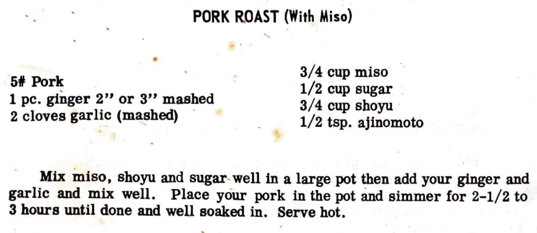 Mix miso, shoyu and sugar well in a large pot then add your ginger and garlic and mix well. Place your pork in the pot and simmer for 2-1/2 to 3 hours until done and well soaked in. Serve hot.