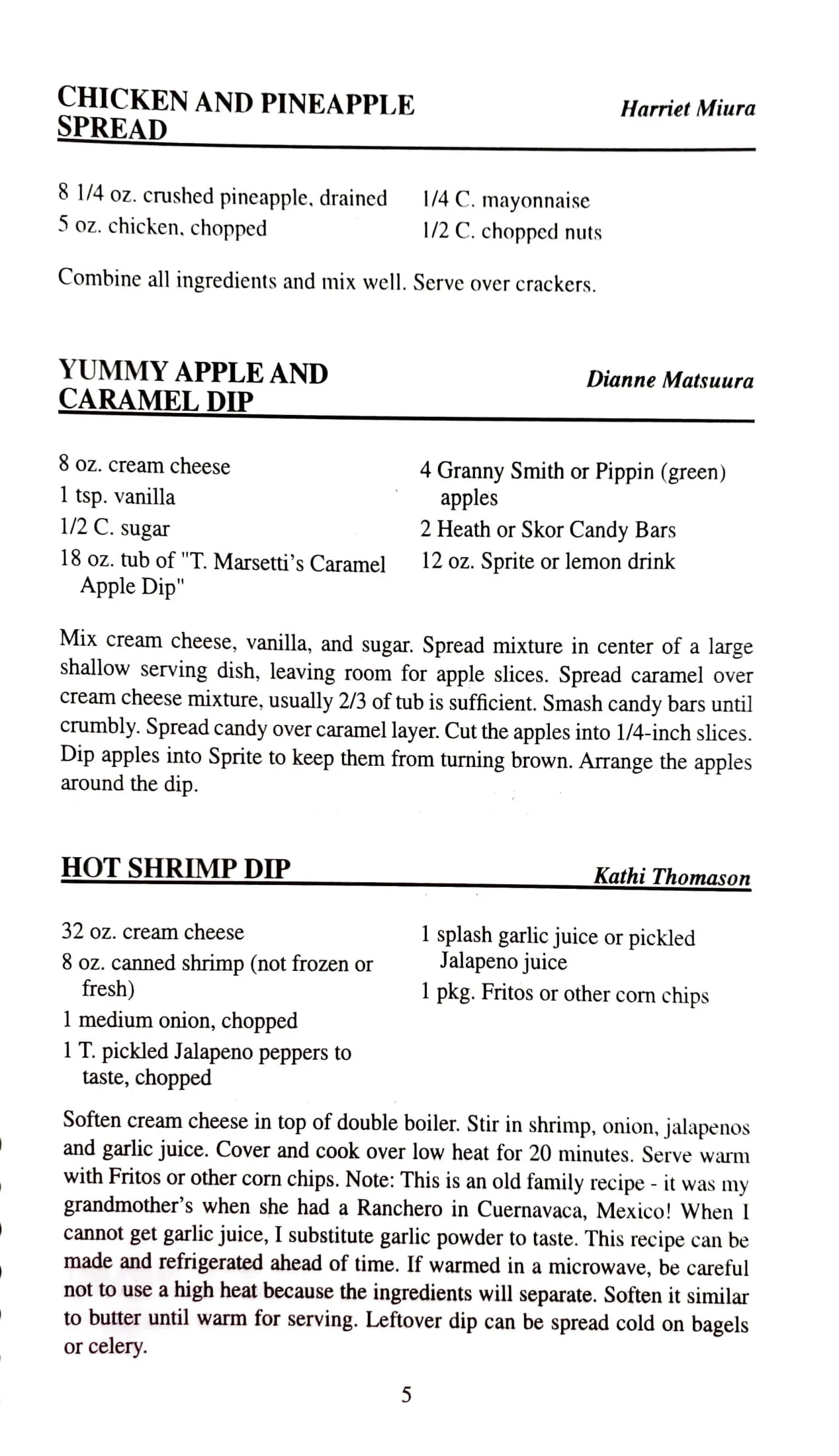 Black bean soup Cream cheese (optional) 1 tsp. of onion juice Drop of Tabasco sauce Mix together and sprinkle yellow cheese over top. Very good with corn chips. Variety of ready prepared dips or mixes are available. Bring prepared dips to room temperature for better flavor and easier spreading.
